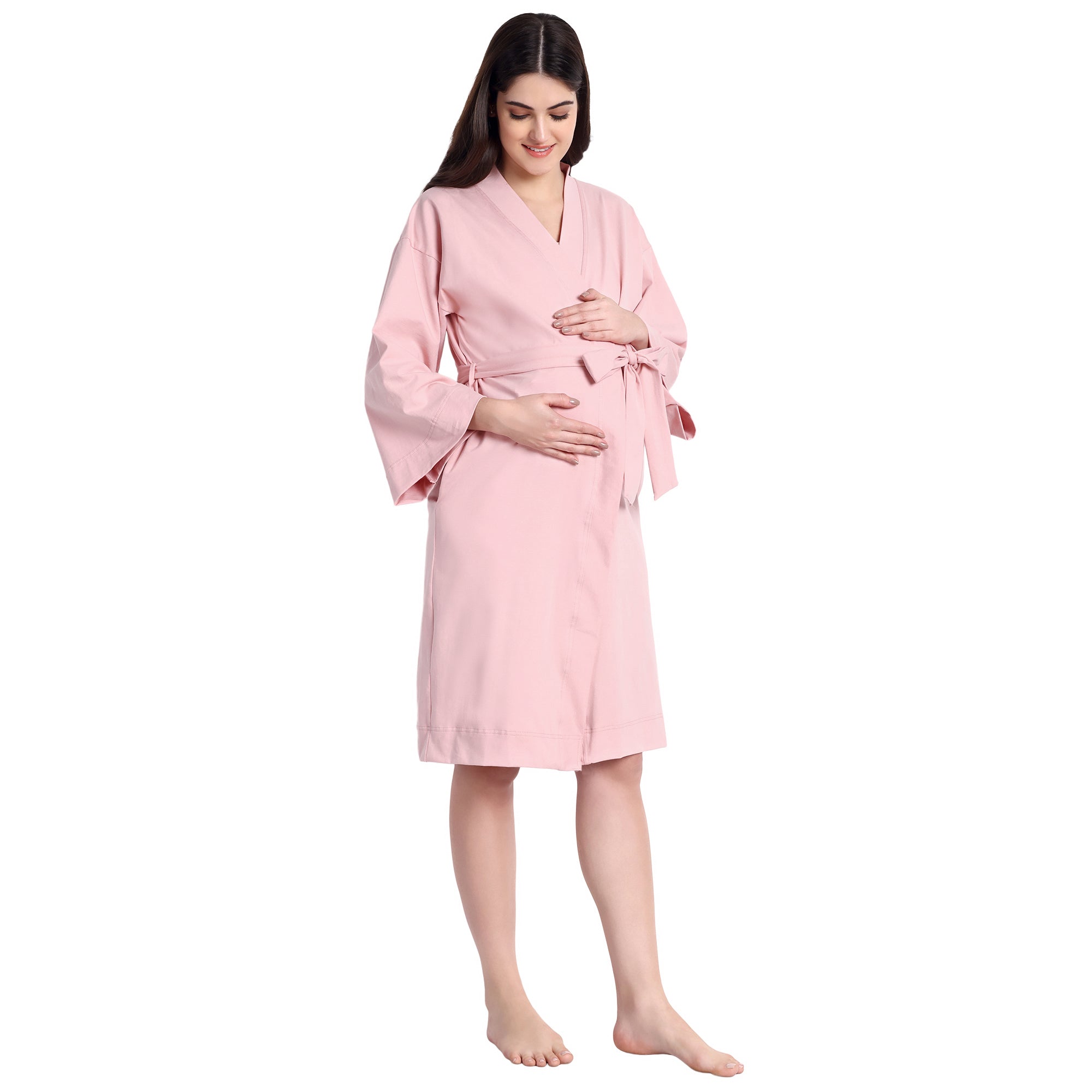 - Construction: This maternity robe is handmade from cutting to the stitching process. It includes inner ties, loops, belts, and concealed pockets.