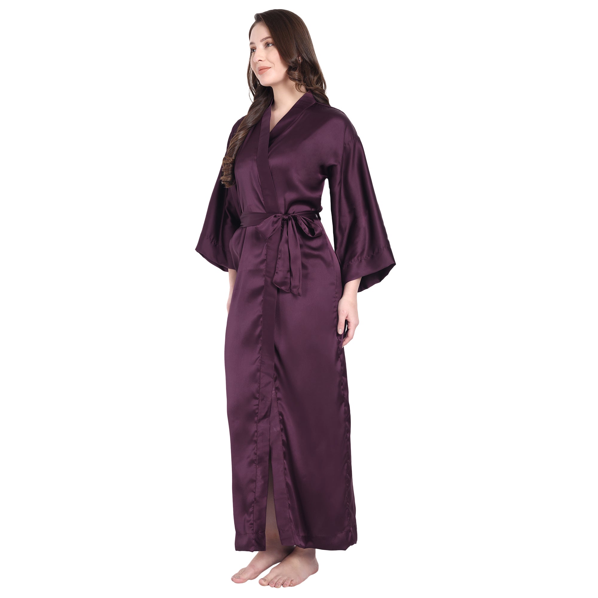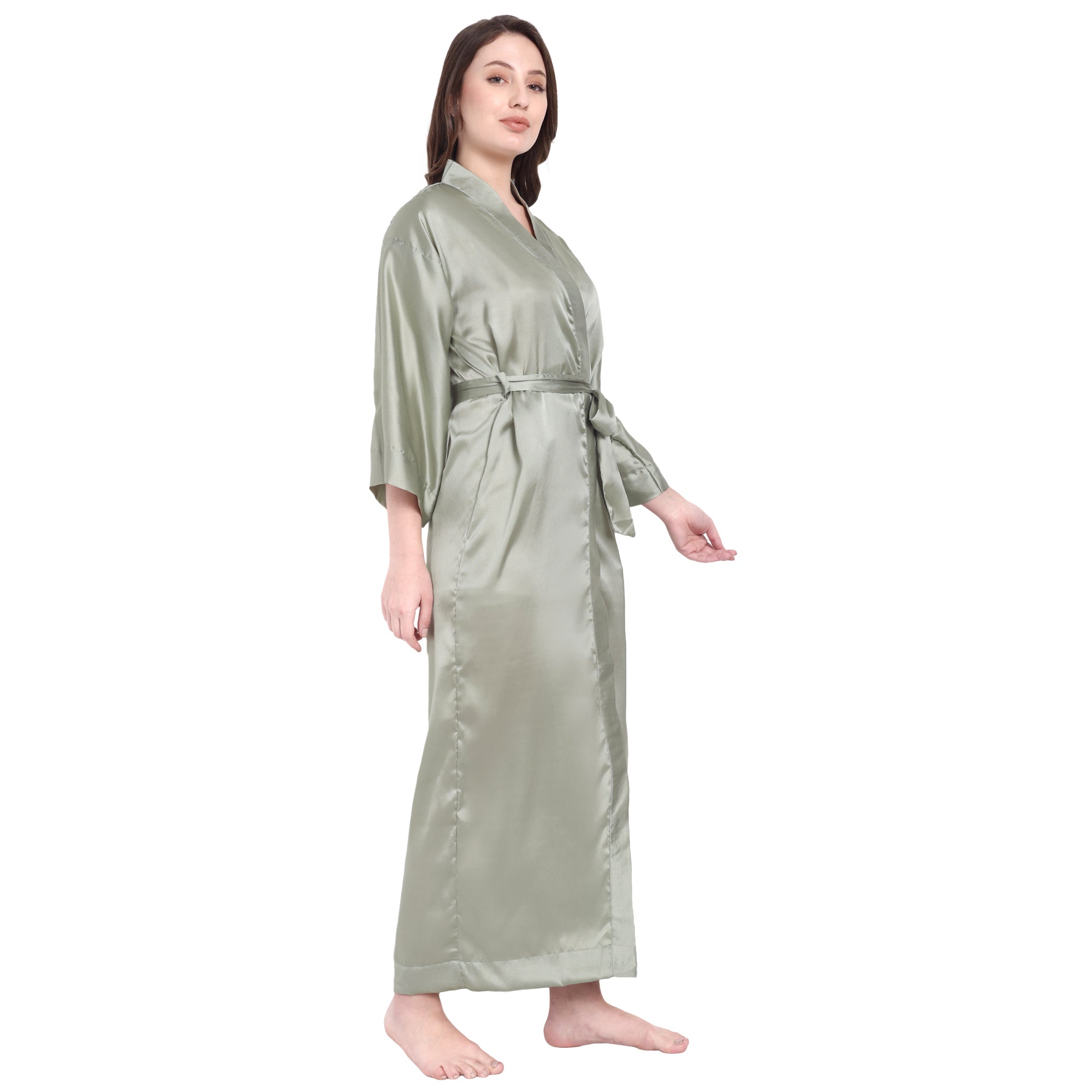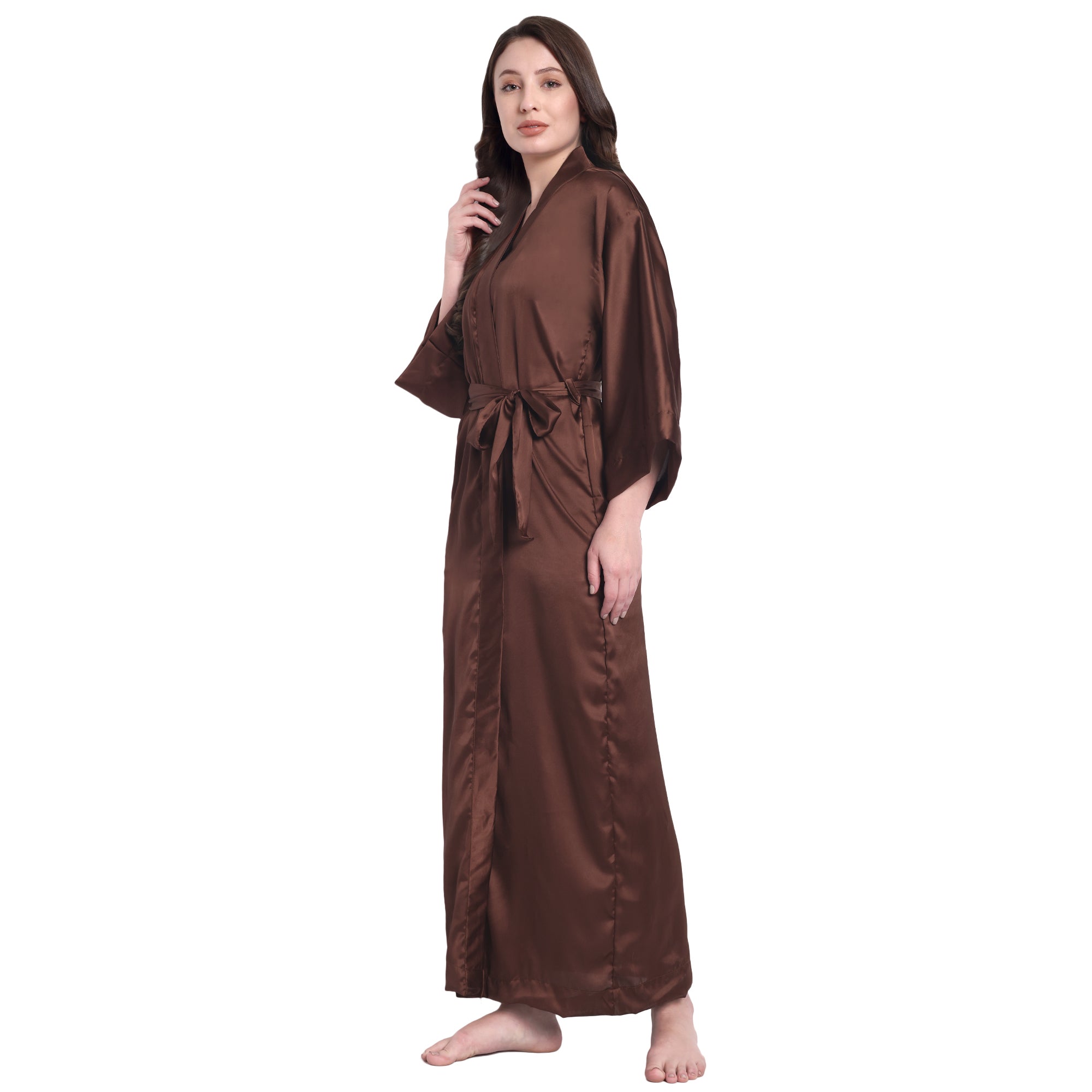 A luxurious ankle-length satin robe that feels like silk and flatters every body type.