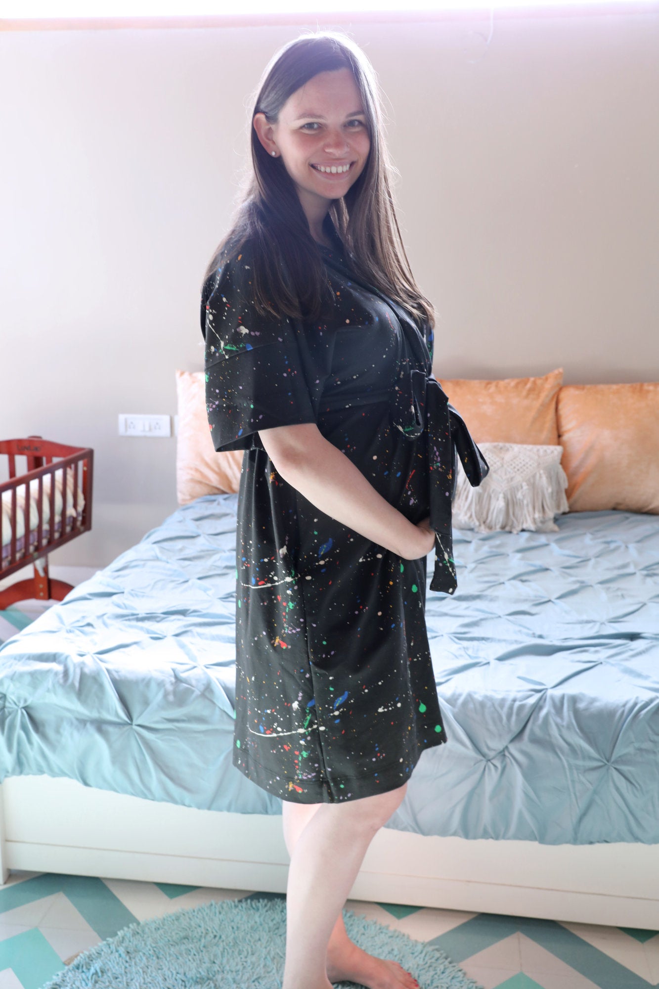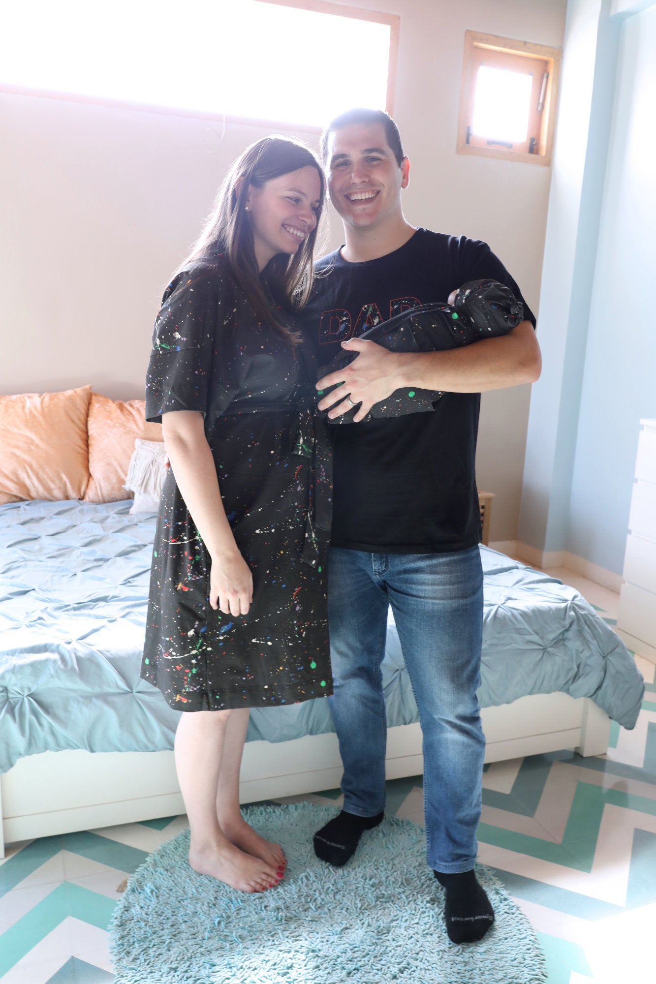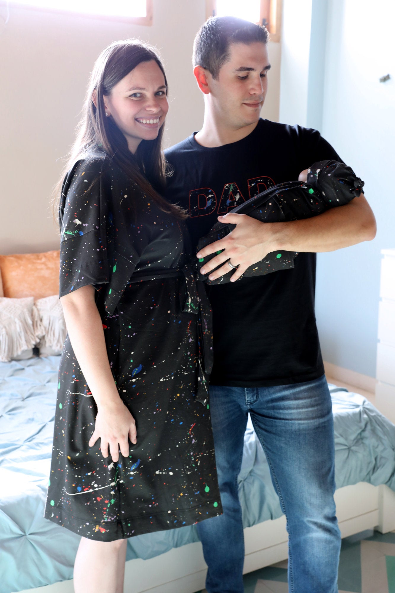 The mom robe is designed for labor, delivery, and postpartum comfort, with a relaxed fit, inner ties, and easy nursing access. Dad’s shirt ties the theme together while staying comfortable through long hospital hours. The newborn swaddle wraps baby snugly in the same artistic splatter pattern, making it perfect for birth announcements, hospital photography, and coming-home moments.