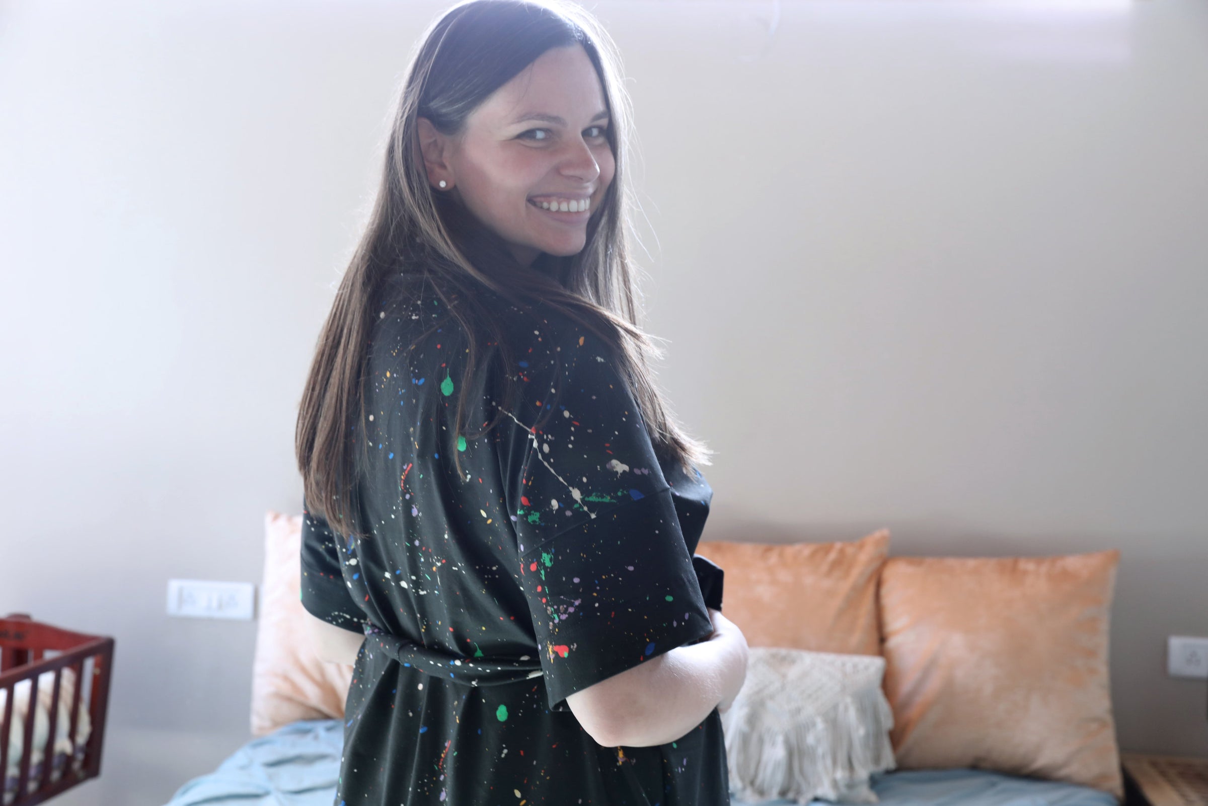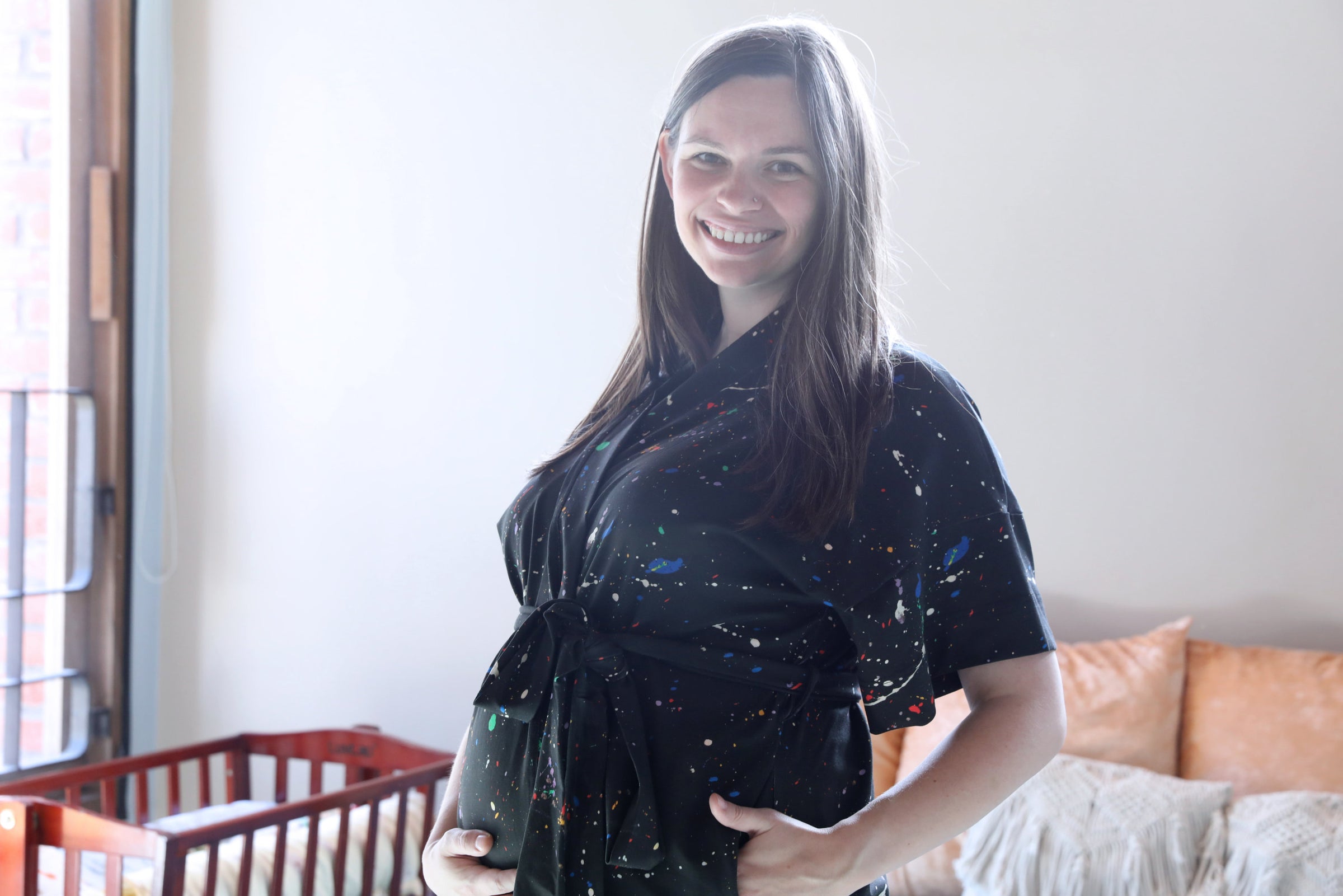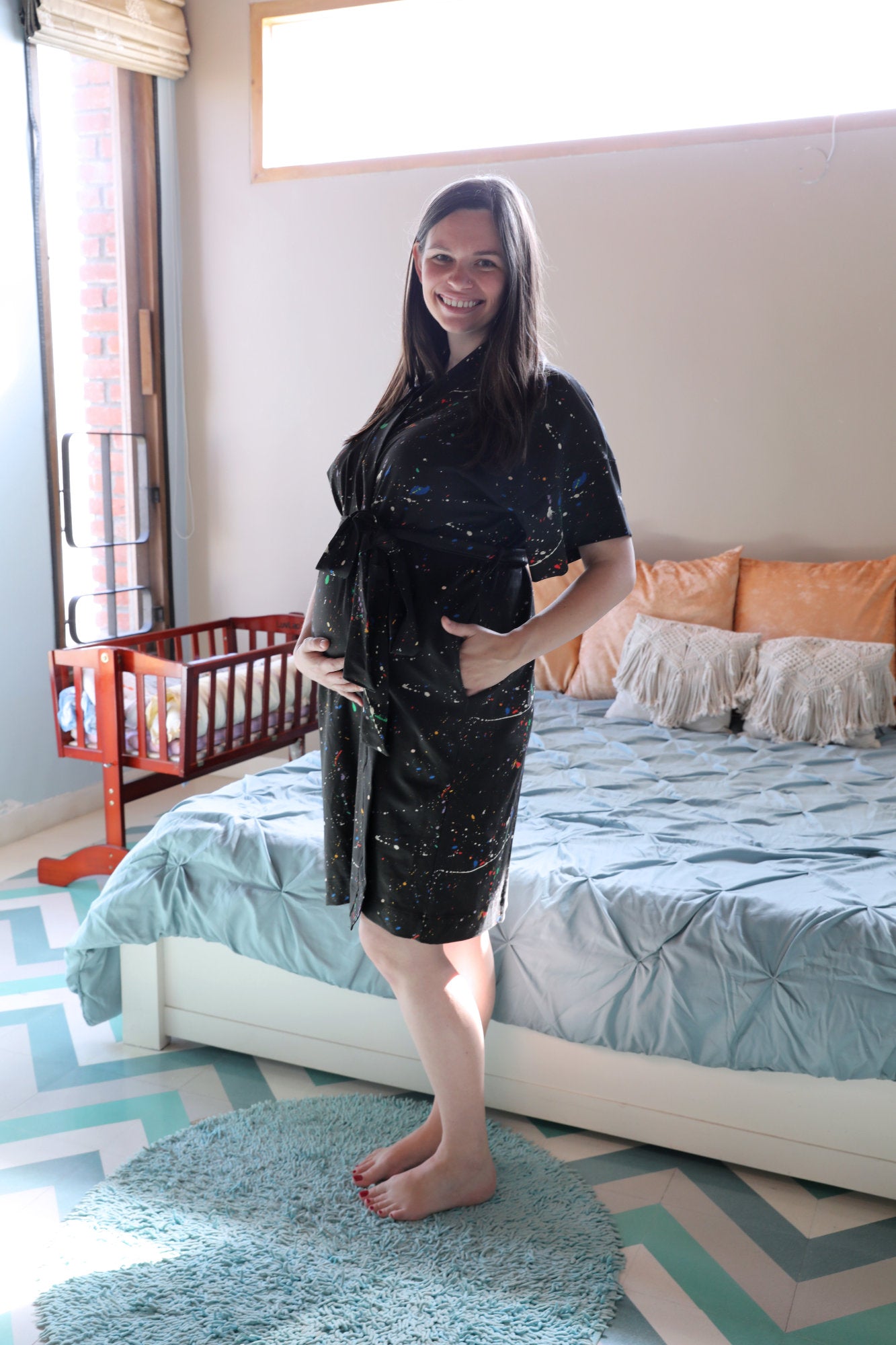 The mom robe is designed for labor, delivery, and postpartum comfort, with a relaxed fit, inner ties, and easy nursing access. Dad’s shirt ties the theme together while staying comfortable through long hospital hours. The newborn swaddle wraps baby snugly in the same artistic splatter pattern, making it perfect for birth announcements, hospital photography, and coming-home moments.