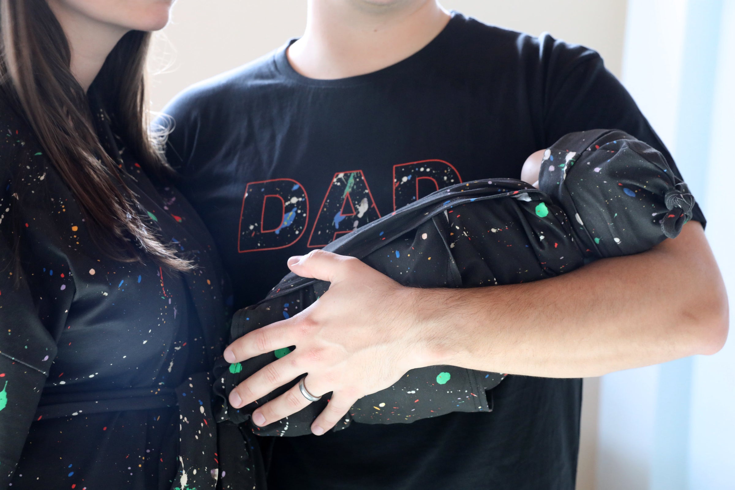 Paint Splatter Mommy, Dad & Newborn Matching Hospital Set – Maternity Robe, Dad T-Shirt, Swaddle + Big Bro/Big Sis Tees